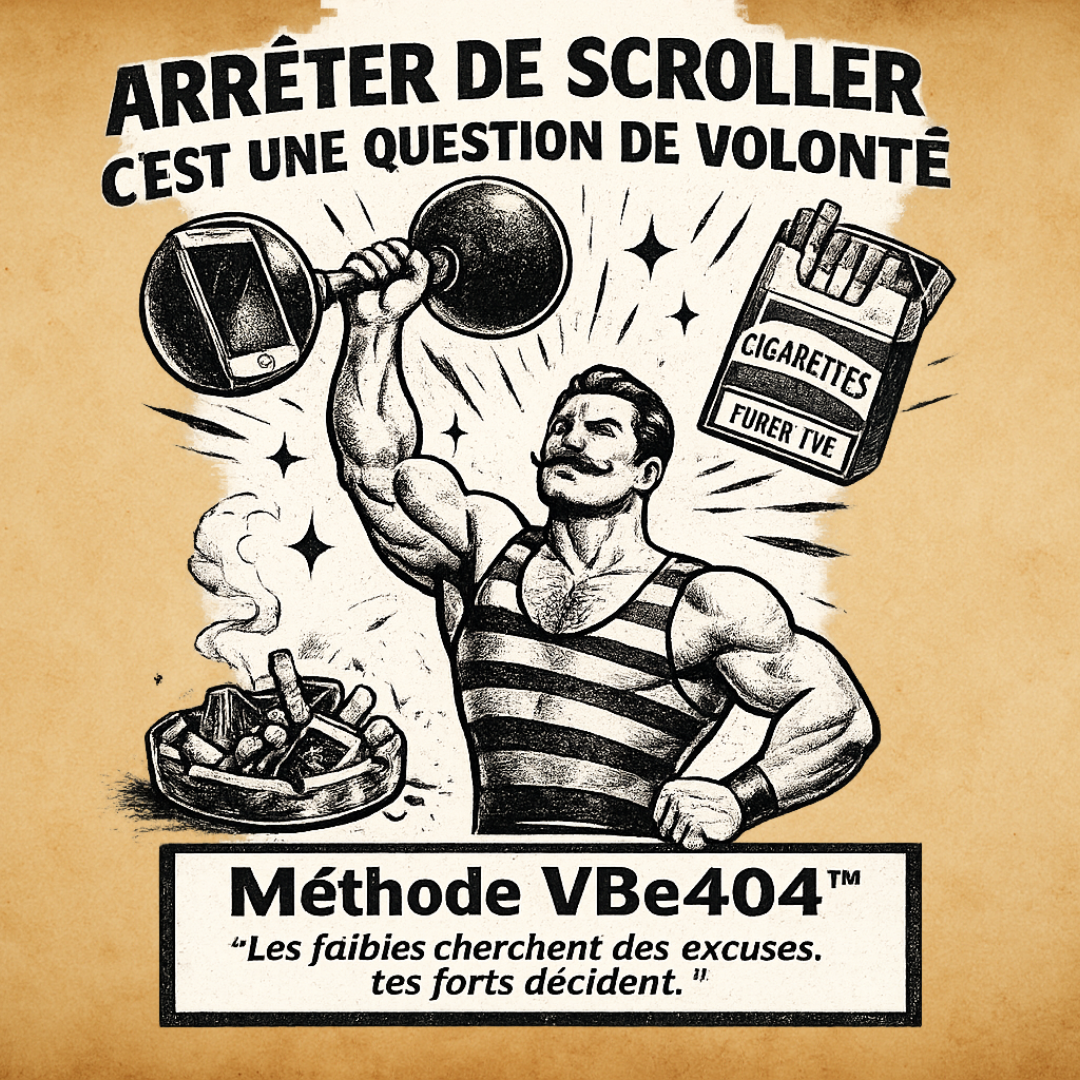 Affiche affirmant “arrêter de scroller c’est une question de volonté” avec un homme musclé soulevant un smartphone, illustration satirique du discours sur la volonté